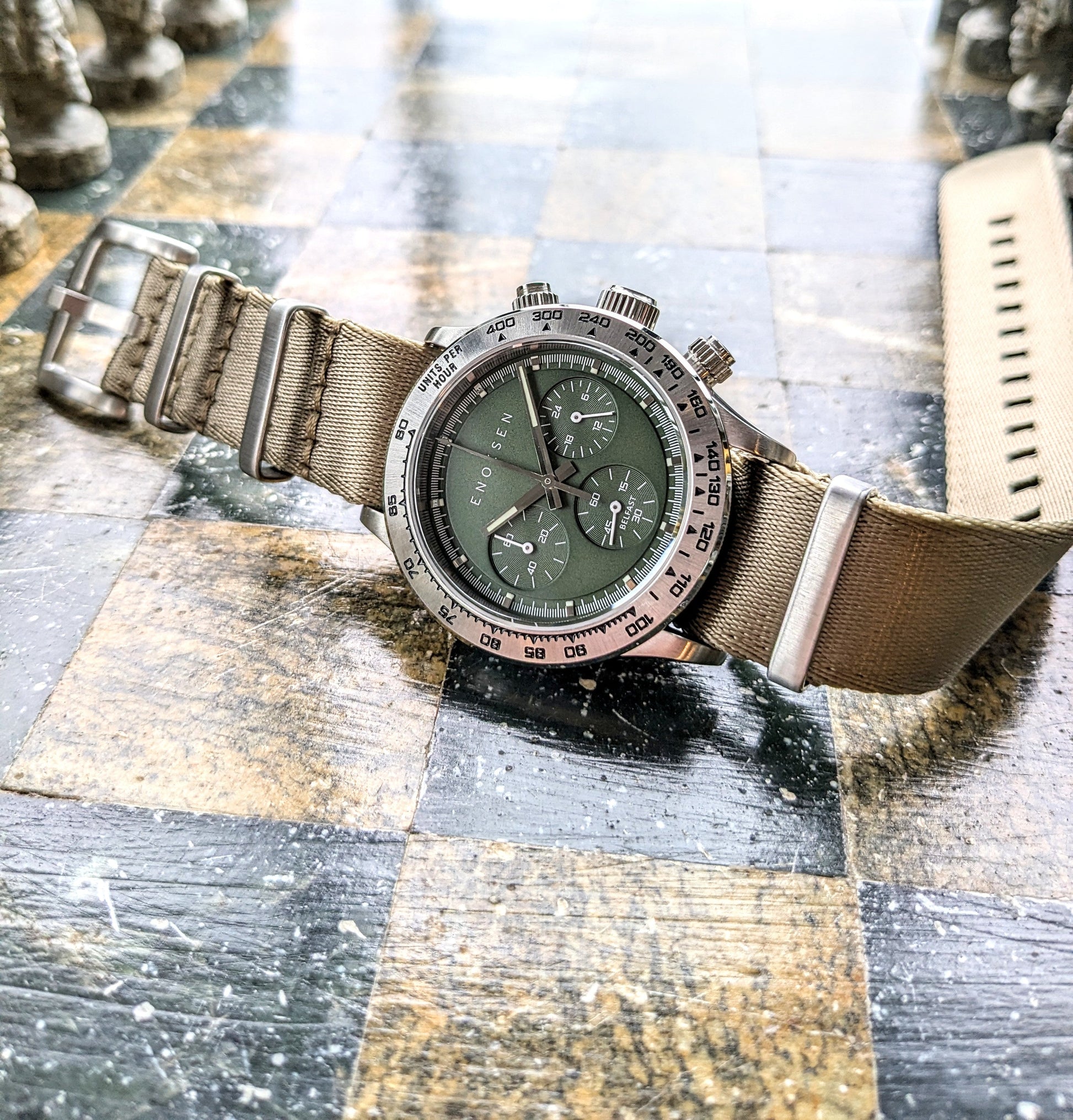 Colour Coded Style: Paired with a matching green Tropic strap, the watch showcases the understated elegance typical of Enoksen watches.
